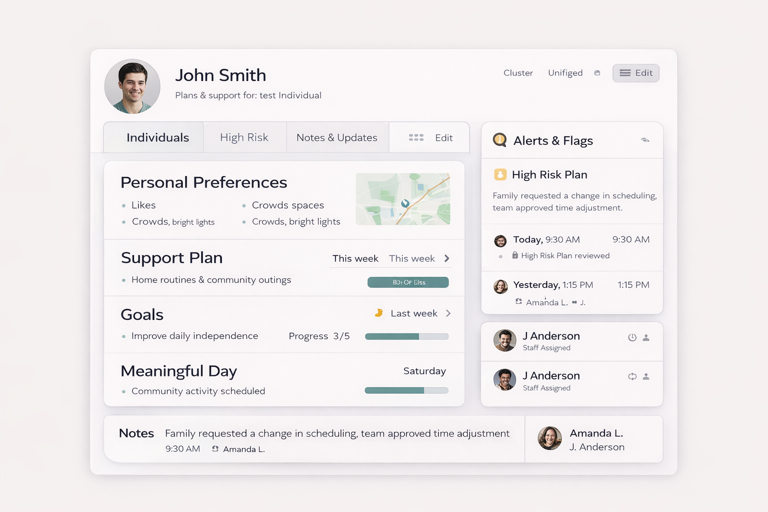 Individual plans and preferences flow directly into scheduling, documentation, and billing — automatically.