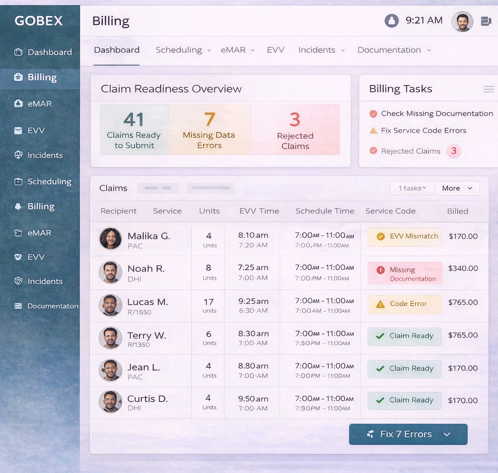 GOBEX connects EVV, scheduling, documentation, and service codes into one clean billing flow — so you submit claims that are accurate, compliant, and ready to be paid.