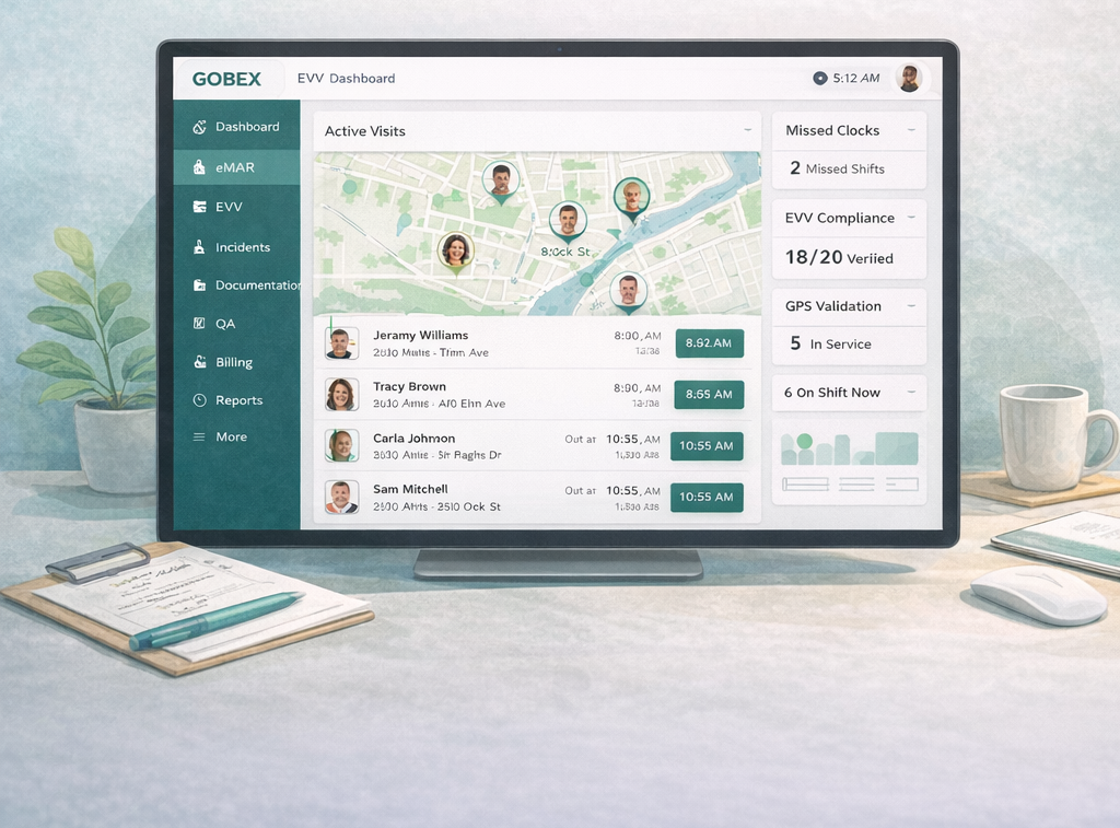 Gobex EVV ensures each shift is clocked in correctly, tied to a real location, matched to the correct individual, and aligned with the scheduled service.